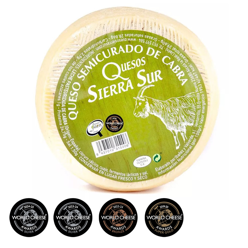 Queso semicurado de cabra Grande (Peso mínimo 2,2 kg). Queso premiado con SUPER GOLD en concurso World Cheese Awards en el año 2019, Medalla de Bronce en el año 2022 y medalla de plata en el año 2023.
